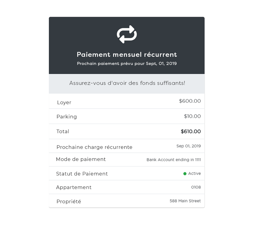 Vous méprisez les frais de retard ? Avec Letus, vous ne manquerez plus aucun paiement. Configurez simplement des paiements mensuels récurrents, en utilisant soit votre compte bancaire, soit votre carte de crédit avec points.